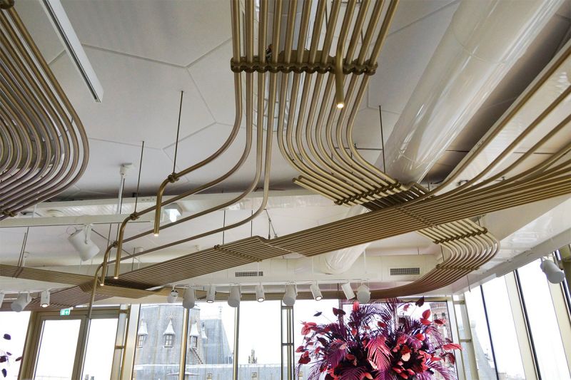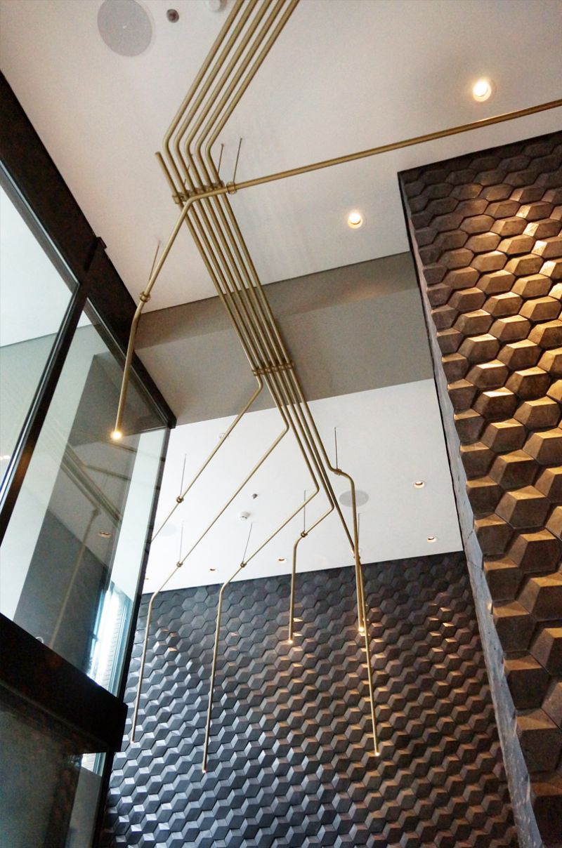 W częściach wspólnych hotelu wykonaliśmy zjawiskową instalację z rurek. Do produkcji użyliśmy ponad 6 kilometrów rur, malowanych na kolor mosiądzu. Wyzwaniem było utrzymanie ciągłości instalacji zmieniającej się w ścianki działowe, części baru, siedziska czy dekoracyjne oświetlenie.