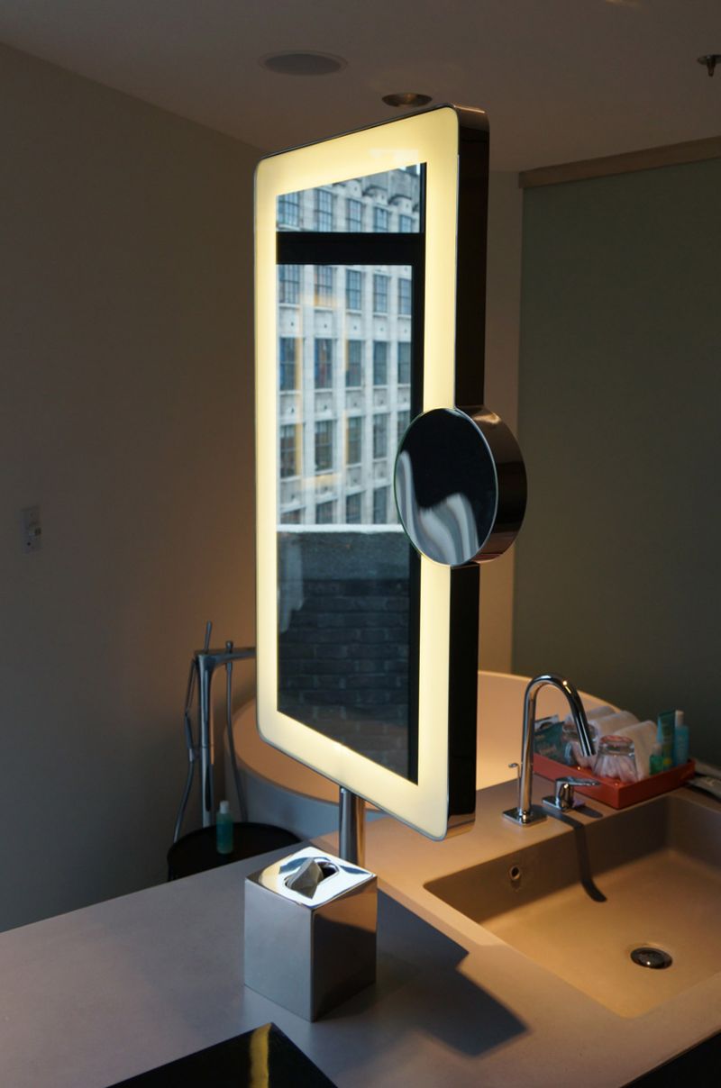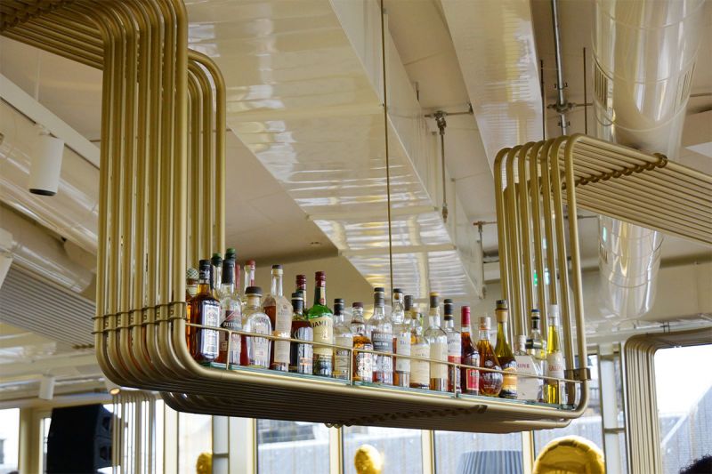 Została ona zaprojektowana i wyprodukowana z anodowanego aluminium, specjalnie wytłaczanych profili i modułów LED ukrytych za złotym lustrem weneckim.