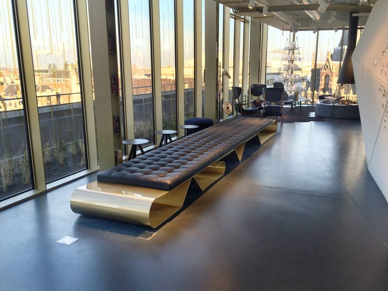 Do lobby dostarczyliśmy 6-cio metrową sofę, której podstawa to forma ciągłej wstęgi wykonana z blachy mosiężnej grubości 5mm, natomiast siedzisko to naturalna skóra z ponadczasowym wzorem szycia. Wielkość tej sofy zmusiła nas do wykorzystania dźwigu w celu dostarczenia jest na 6 piętro.
